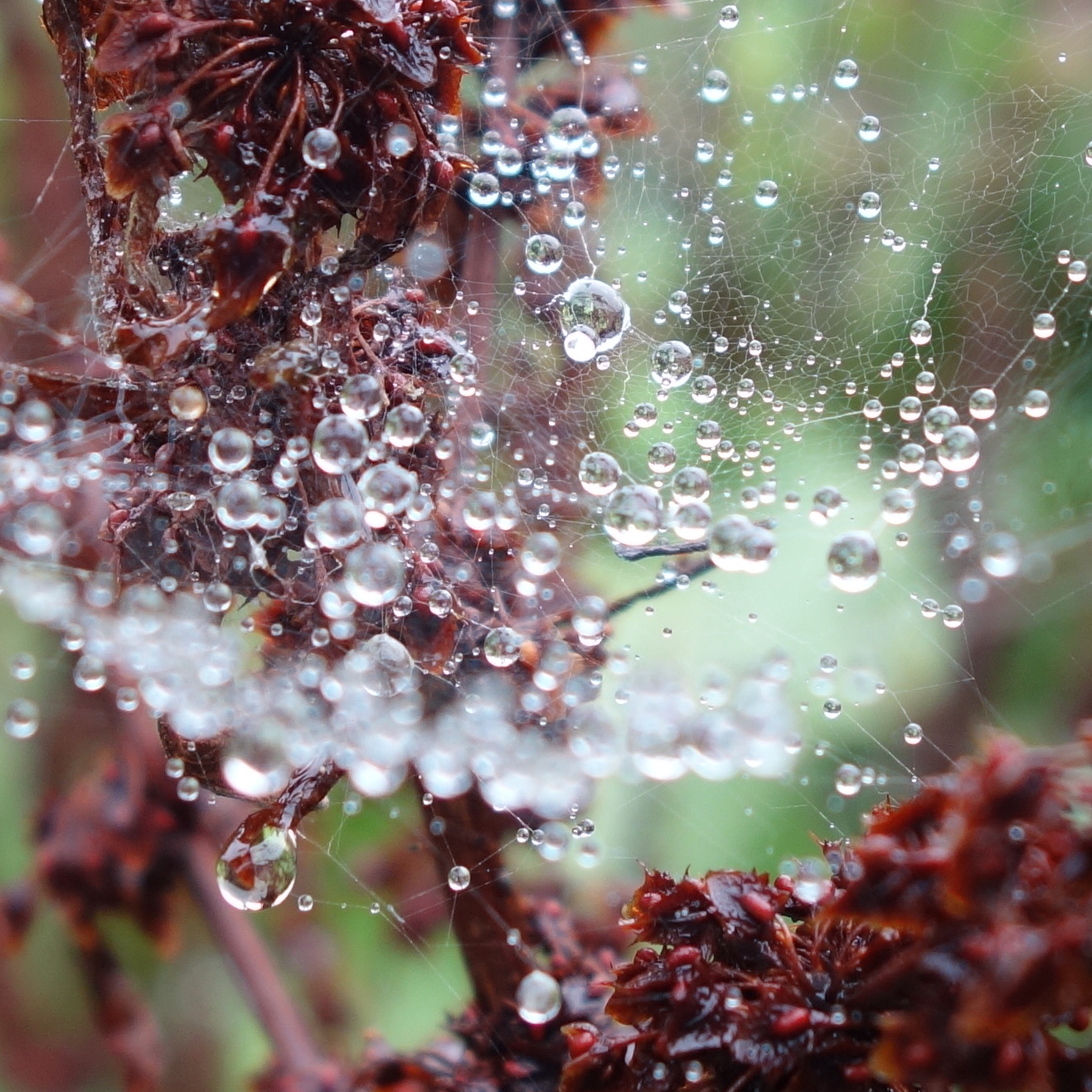 I’m a blogger this morning, also a photographer. I captured the rain and spiders silk all caught on the deep bronze seed head of a dock plant, a dock plant allowed to exist in my non-intervention garden, repaying me with so much beauty.