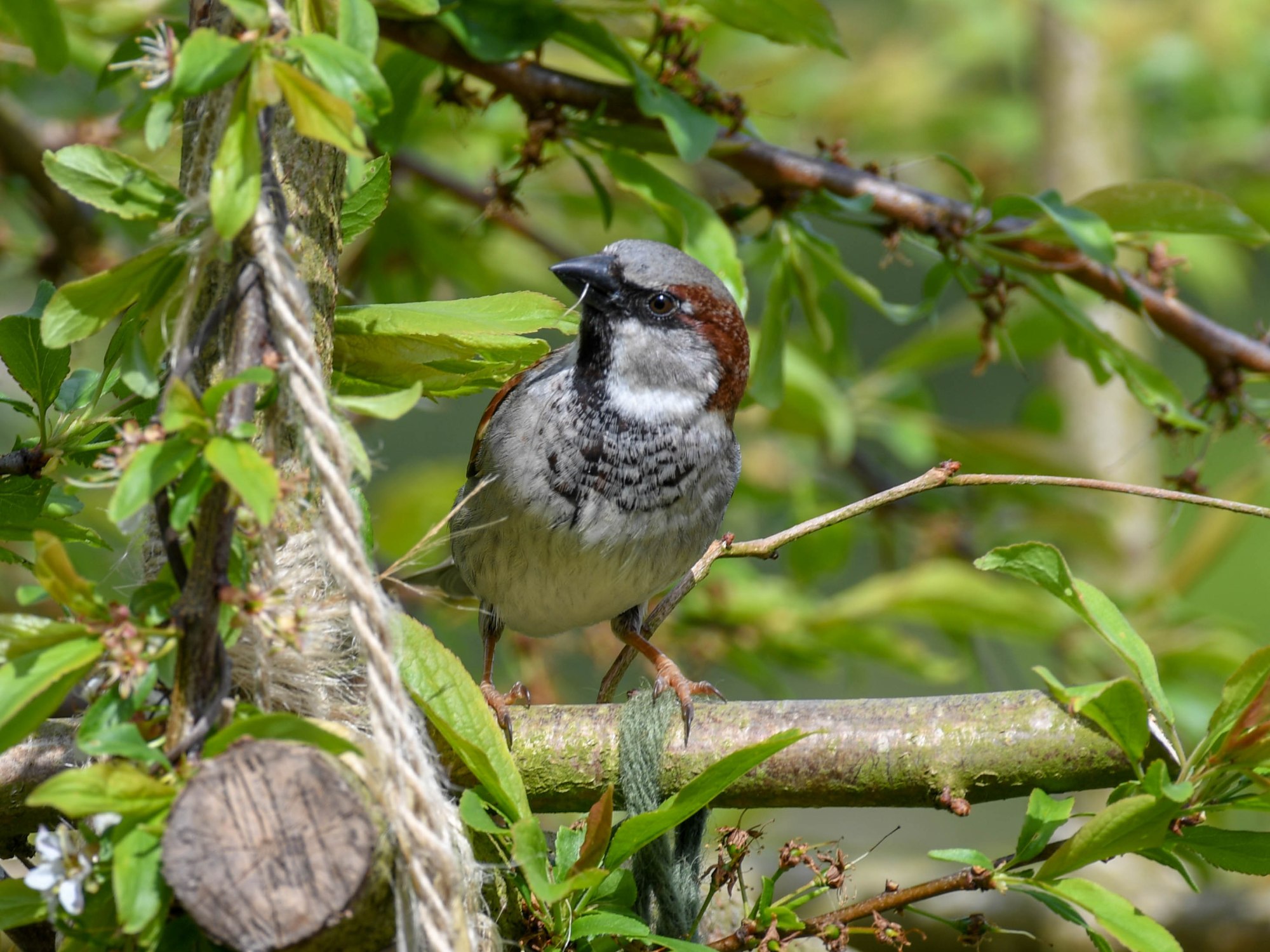So it’s like this. I’ve got a new camera, and lots of sparrows in my garden. This particular one has been tugging at the string that ties the plum arch to the framework. I think he wants to use it to build a nest.