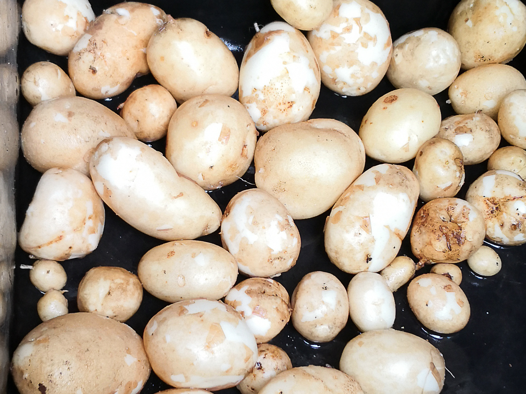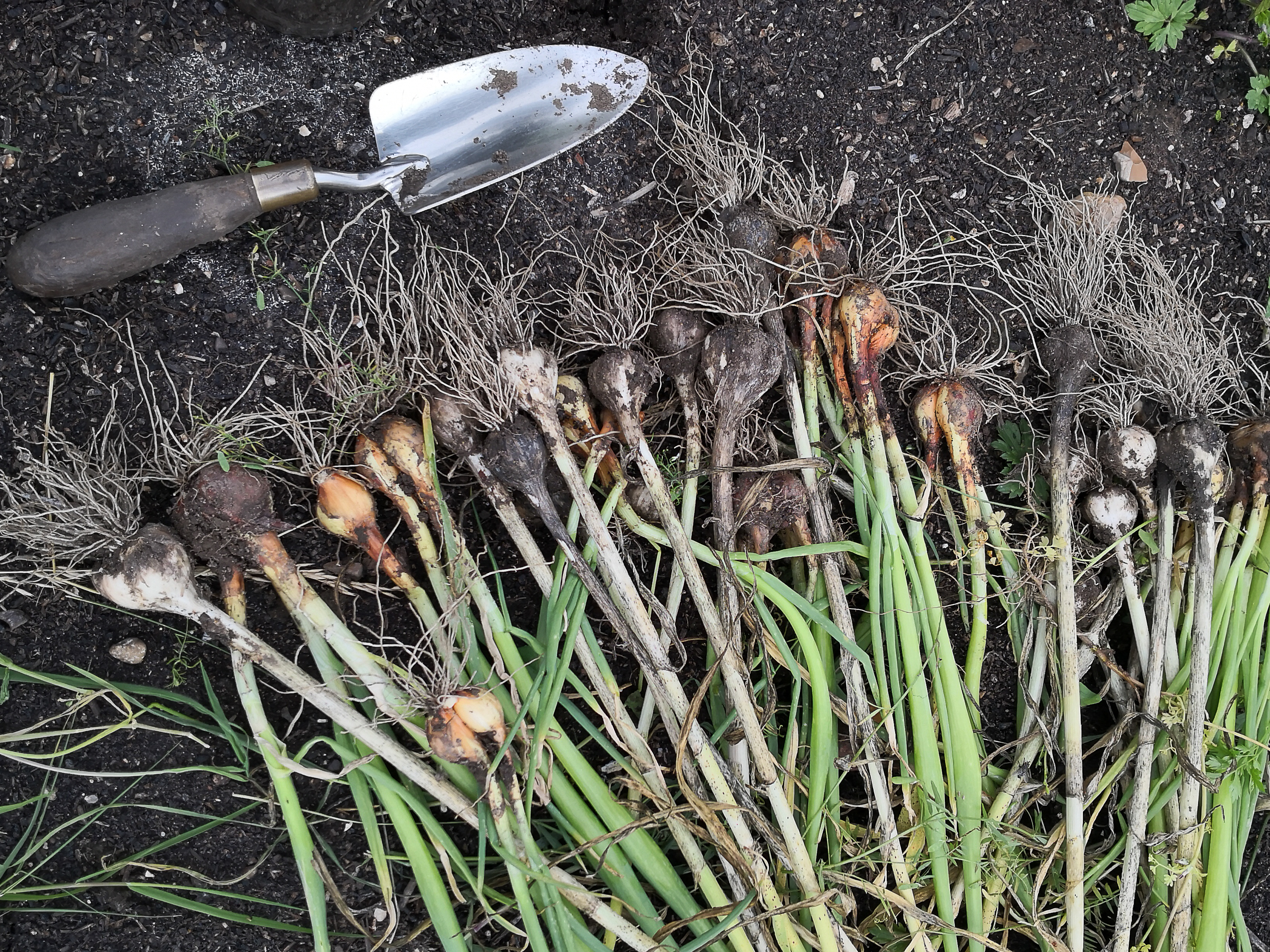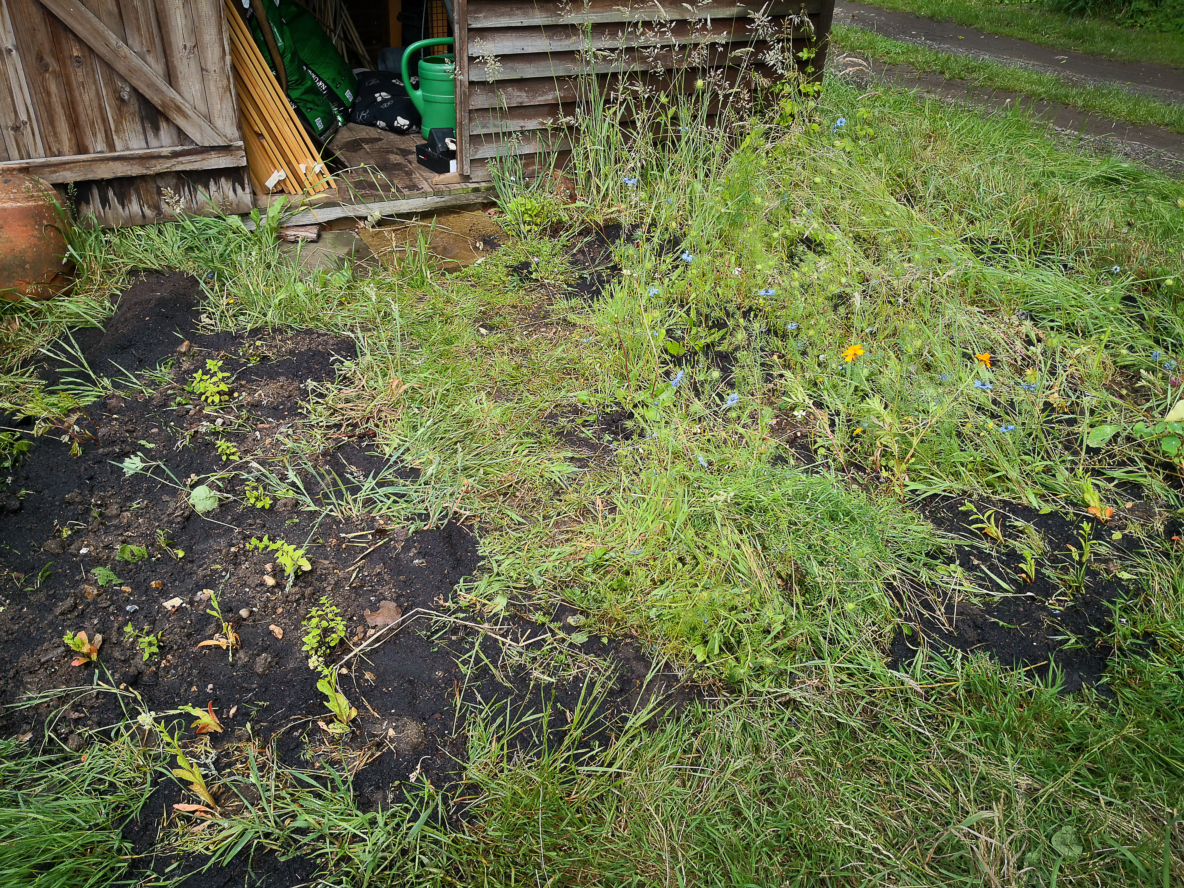 New potatoes, new flower planting by my shed and Lettuce Vienna, from some old seed, a variety that seems to have disappeared, and for which I have high hopes.